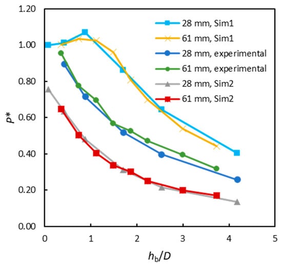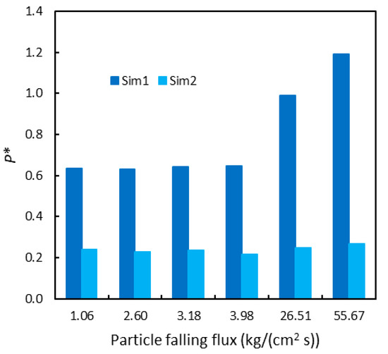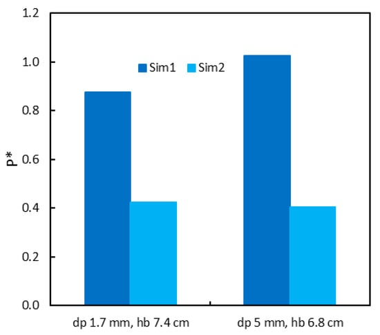The last studied variable was the particle density. Theoretically, it affects the magnitude of the pressure at the bottom, but not its trend as a function of the bed height, as it can be gathered from Equation (1) (dividing both members by Psat). As Figure 14 depicts, the results provided by MFiX are coherent with these expectations, with P* remaining roughly constant even for very marked variation of the particle density. There actually seems to be a moderately decreasing trend, but its magnitude is so small within the whole density range that it can be neglected.