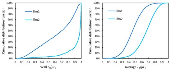 Cumulative distribution of the ratio between the tangent force and its maximum value for particle‑wall contacts (left) and all contacts (right).