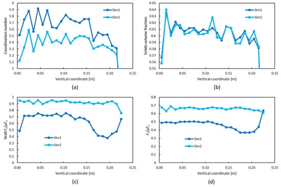 It may also be useful to assess how the particle distribution and forces vary along the bed height. To this end, Figure 7 shows the variation of four relevant variables along the bed height: the coordination number, the particle volume fraction, the value for particle-wall contacts and all contacts of the ratio Ft/µFn. These plots were obtained dividing the control volume in cylindrical slices with heights of 1 cm. The plots show a very abrupt variation of the coordination number (Figure 7a), which markedly decreases after the upward movement of the wall. This is in line with our previous hypothesis about the configuration of particle in Sim1: due to the initial high kinetic energy, lower particles pack in a very close way and do not manage to redistribute their weight on the lateral wall. Conversely, in Sim2 the contacts between particles decreases, and more so in the lower portion of the bed. This effect cannot be clearly observed for the particle volume fraction (Figure 7b): it reduces as well from Sim1 to Sim2, but its variation is much less apparent, and the slightly decreasing trend is preserved. For the Ft/µFn ratios (Figure 7c,d), the considerations drawn for the previous Figure still apply. Additionally, it is interesting to observe that these two ratios display a more constant trend in Sim2, losing the local minimum that they both featured in the higher portion of the bed for Sim1.