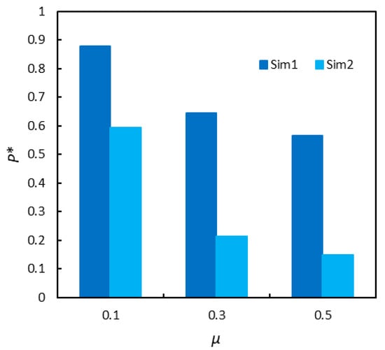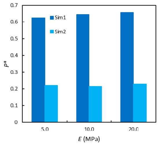 The first investigated aspect was the Young modulus E. For DEM simulations of poor-to-moderately packed systems, the particle stiffness is usually considered much lower than its actual value: this has been shown multiple times not to hinder the simulation results [40,41,42]. However, the present configuration is rather packed, so it is best not to decrease the stiffness excessively. When simulating glass particles with the Hertzian contact model, a value of the order of 107 Pa is often employed for the Young modulus, as a compromise between computational complexity and accuracy [10,37,38,43]. Increasing the order of magnitude of this constant would have prevented us from achieving results within acceptable time. Thus, we only tried moderately modifying the value of the variable, to assess whether this would cause a vigorous friction difference. As Figure 9 shows, this was not the case. There seem to be a positive trend between the value of the particle stiffness and the bottom pressure, but the variation is too small to be appreciable. Moreover, while increasing the value of E should be more realistic, the P* values of Sim1 seem to further deviate from the experimental one.