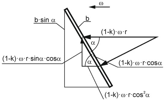 The liquid stream flowing through the impeller with blades inclined in relation to the plane z = const at the angle α = const (the angle does not vary along the radius r) can be estimated based on theoretical considerations. Figure 1 shows the components of the velocity vector in the radial and axial directions (b—the width of the shoulder blade, α—the angle of inclination of the blade relative to the plane of movement, U = ω·r –tangential speed of the blade).