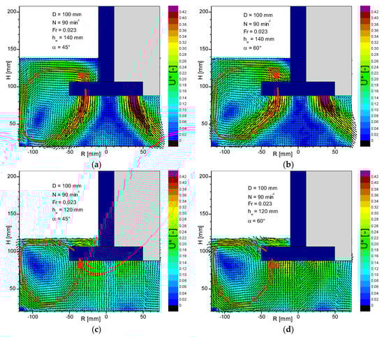 Liquid flow before the partition for the PBT45 and PBT60 impellers: (a) hw = 140 mm, α = 45°; (b) hw = 140 mm, α = 60°; (c) hw = 120 mm, α = 45°; (d) hw = 120 mm, α = 60°.