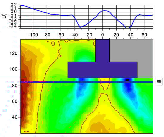 Map and profile of axial velocity at a height of h = 85 mm above the bottom for hw = 140 mm and N = 90 min−1 (PBT45 impeller).
