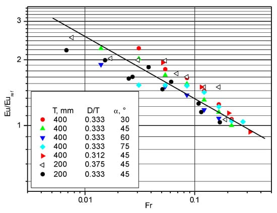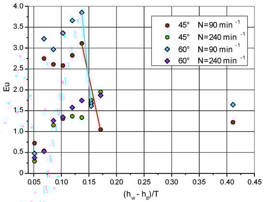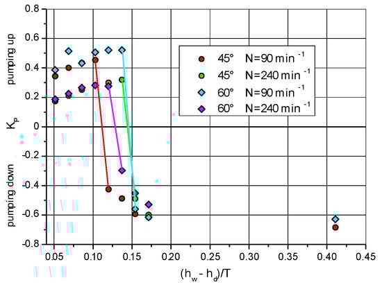For k = 0 i α = 45° we obtain Kp = 0.822, and for α = 60° Kp = 0.712 and similar values can be found in the literature []. The values obtained are greater than those measured, because in fact the peripheral velocity of the liquid is lower than the speed of the blade, i.e., k > 0. Even more value Kp = 1.167 dla h/T = 0.33 is obtained from the correlation given by Fořt [] for mixers with a blade inclination angle α = 45°