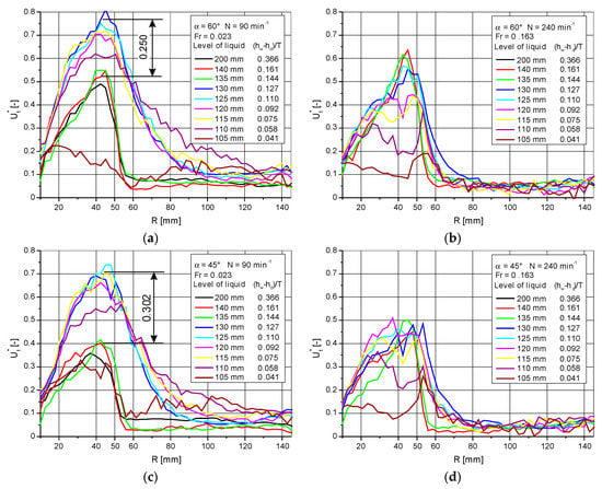 Tangential velocity profiles at the height of the impeller hm. (a) N = 90 min−1, α = 60°; (b) N = 240 min−1, α = 60°; (c) N = 90 min−1, α = 45°; (d) N = 240 min−1, α = 45°.