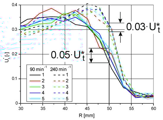 For pumping the liquid down (towards the bottom) at high liquid heights in the tank, low values of the mixing power were obtained. For the PBT45 impeller, direct measurements gave Eu = 1.53, and for the PBT60 impeller, Eu = 2.18. These results are consistent with the data in the literature [,]. The tangential velocity of the liquid at the outlet of the agitator has a great influence on the results obtained. For example, for the PBT45 impeller under the conditions of N = 90 min−1, hw = 140 mm, the measurements obtained the value of Eu = 1.05 for Cu = 0.09 m/s, but at a distance of R = 48.4 mm from the impeller axis the tangential velocity of the liquid is 0.132 m/s and the calculated power number value is Eu = 1.535. Unfortunately, it is practically impossible to determine the measurement error in the PIV method []. In addition, in asynchronous measurement, when the position of the blades in relation to the velocity profile determination line (plane) changes, the initial position of the blade may affect the results obtained. This is illustrated in Figure 8 showing the results of five consecutive measurements made to test this thesis. The differences in the values of the tangential velocity of the liquid for the radius of the stirrer Rm = 50 mm may reach about 0.05 of the velocity of the end of the stirrer blade. For the profiles from Figure 8, the values of the power numbers are obtained from Eu = 1.195 to Eu = 1.445 for N = 90 min−1 and from Eu = 1.888 to Eu = 2.145 for N = 240 min−1.