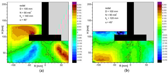 The results of the experiments presented in the paper allow for a preliminary hypothesis concerning the mechanism of increasing mixing power when emptying the mixers during the operation of the axial impeller while pumping the liquid down the tank []. The critical moment of the mechanism analyzed is undoubtedly the moment of changing the direction of the liquid flow through the impeller area, despite the unchanging parameters of the impeller itself. According to results from the analysis of the velocity distributions shown in Figure 3 for the liquid height in the tank hw = 140 mm, the liquid flows in the direction of liquid pumping through the rotating impeller (Figure 3a,b), and for hw = 120 mm the liquid flows through the area of the impeller in the opposite direction, i.e., to the bottom of the tank. This occurs when the liquid height above the upper edge of the impeller is approximately 10–15 mm. With high probability, it can be assumed that at this point the liquid layer above the impeller is so small that there is no possibility for secondary circulation lines, i.e., axial-radial circulation, to close within it. The rotating impeller starts to work like a radial-circumferential agitator (Figure 6). The impeller accumulates the liquid in front of the paddle, which increases the resistance to motion and increases the tangential velocity. At the same time, the stream of liquid ejected from the area of the impeller at a relatively high speed (Figure 9) begins to flow towards the bottom of the tank at the wall, thus changing the direction of circulation, which is shown in Figure 3c,d. It should be emphasized that this is a working hypothesis and a more extensive cycle of tests should be performed to confirm it. Figure 10 Radial represent the velocity maps: (a) hw = 140 mm; (b) hw = 120 mm.