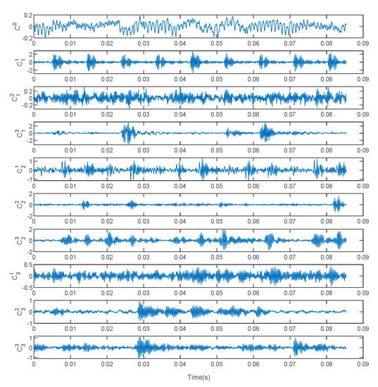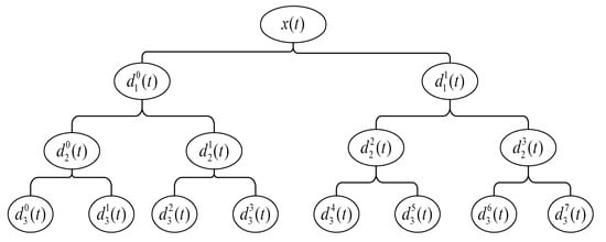 where and are conjugate filters, which are low-pass filter and high-pass filter, respectively. Use WPT to project the time–frequency component of the signal into the orthogonal wavelet subspace to form a WP complete binary tree. is defined as the vector space corresponding to the WP parent node, and the vector space corresponding to each node will be decomposed into two mutually orthogonal subspaces, as shown in the following equation.