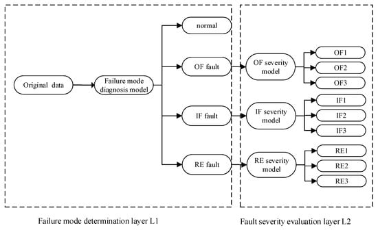 An effective bearing fault diagnosis method should include fault location identification and fault severity identification. Fault location identification is an important technique because it can guide the repair or replacement of corresponding parts. At this stage, a lot of research is focused on the diagnosis of fault location, while ignoring the deterioration of the degree of fault damage. For most machines, the deterioration of the degree of failure is a gradual process. The identification of the severity of the failure provides evidence about the remaining life of the equipment and helps determine the urgency of repair. However, it is difficult to identify the fault location and fault severity at the same time, requiring highly representative features and a powerful classification model. This kind of complex fault diagnosis system will bring greater risk to the misjudgment of fault type. Some scholars assign the failure mode and the severity of each failure to a specific label. For example, Ding et al. [16] studied the use of wavelet packet multi-scale feature extraction and deep convolutional neural networks for rotating machinery fault diagnosis. You et al. [17] improved the traditional activation function and proposed a new convolutional neural network for fault diagnosis of rotating machinery. However, in their method, the model is still a single-level model. Although failure mode and failure severity can be evaluated at the same time, the hierarchical information between failure mode and severity is ignored. Model complexity is high, parameter adjustment is difficult, model convergence performance and diagnosis accuracy are poor.
