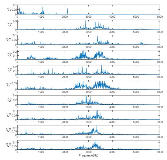 represents the sum of the frequency band energy corresponding to all frequency band subspaces of layer . The energy values of the frequency bands corresponding to all the nodes of the -th layer can be obtained from Equation (5), and the following energy vectors are constructed for the energy of the nodes from the low frequency to the high frequency of the -th layer.