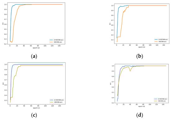 Accuracy rate change curve: (a) and accuracy rate change curve; (b) change in accuracy of and ; (c) change in accuracy of and ; (d) change in accuracy of and .