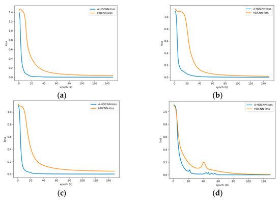 Error loss is an important indicator of model stability. In order to verify the influence of adding learning rate adaptive adjustment strategy on model stability, we summarized the average error loss of different algorithms under different load environments during 20 runs (iteration 150 times), as shown in Table 6. It can be concluded that whether it is the failure mode determination layer or the failure severity evaluation layer, the A-HDCNN model is more stable under various load environments, and the error loss can converge to a minimum. Compared with the HDCNN model, the A-HDCNN model has a smaller error loss. In addition, after verification of the B, C, and D mixed data sets, the A-HDCNN model error can still converge well and the loss is small, which further verifies the stability and robustness of the A-HDCNN model in a variable load environment.