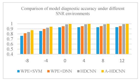 where and represent the intensity of original signal and noise, respectively, we assume is 0 dBW. In this experiment, we will verify the effectiveness of the proposed A-HDCNN model in different noise environments. In order to facilitate the comparative test, we will carry out diagnostic analysis under 1hp load environment, and its SNR is between −8 db and 12 db. At the same time, the HDCNN model, WPE+DNN, WPE+SVM were used as the benchmark for comparative analysis. The experimental results are shown in Figure 15 and Table 9. Obviously, A-HDCNN is superior to the other three benchmark methods, and it can obtain the best diagnostic performance in any noisy environment. In addition, the model has a diagnostic performance of more than 94% at all noise levels, except for the diagnostic accuracy of 87.36% at −8 dB. When the SNR continues to increase, the A-HDCNN model and the HDCNN model, WPE+DNN, WPE+SVM benchmark models have the same increasing trend, and their diagnostic accuracy increases with the increase in the SNR. In addition, we can also infer that the diagnosis error is mainly due to the similarity of the fault feature itself and the difference between the models when the noise is small. That is to say, under different working environments, some different fault signal features may overlap or be close to each other, thereby affecting the accuracy of diagnosis. However, the accuracy of the A-HDCNN model is close to 100% when the noise environment is small, which means that the model has better fault feature learning ability and expression ability, and can have the ability to extract the most essential difference between various fault features. On the other hand, although the performance of all methods decreases with increasing noise, the A-HDCNN model still exhibits good noise immunity in a strong noise environment. Therefore, compared with several other benchmark methods, the A-HDCNN model has stronger anti-noise ability and fault feature learning ability under different noise environments. The A-HDCNN model has strong robustness and stability to noise and is more suitable for the diagnosis of rotating bearing faults in actual operation.