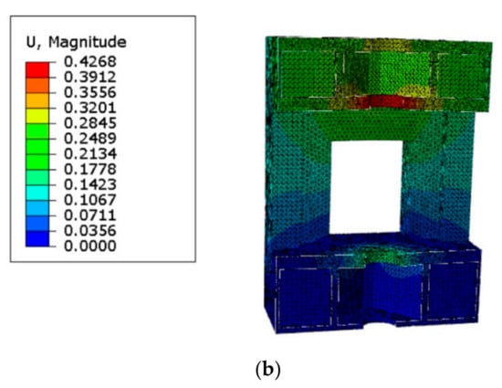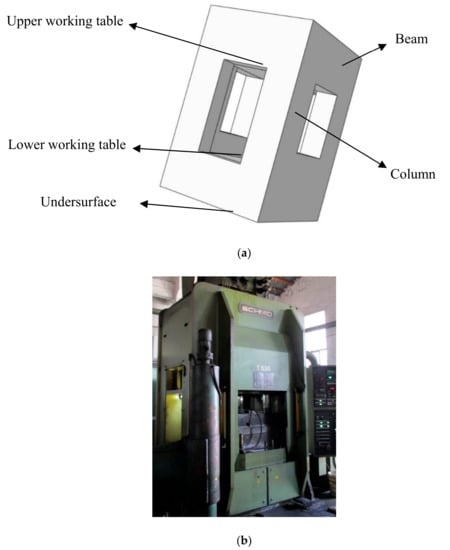 In recent years, some research on static and dynamic analysis of mechanical components and structures has been carried out. In the static analysis aspect, Jiao et al. [] studied static stiffness and modal analysis of a large machine with the software Hyperworks. Fu et al. [] researched the static performance of a drilling machine. Markowski et al. [] investigated the static performance of a clinching joint machine by finite element analysis. Syam et al. [] studied the static properties of a machine frame and carried out experimental verification. Irfan et al. [] reviewed finite element model development and the recent research trends of finite element formulations developed for analyzing sandwich plates. Gohari et al. [] applied finite element analysis to investigate crack initiation and unstable crack growth of the part resulting from gas pressure and the accompanying gas temperature in the gas forming process. Sherbakov [] applied finite element analysis and theoretical analysis to study the three-dimensional stress–strain state of a pipe with corrosion damage under complex loading. Sherbakov et al. [] constructed and analyzed equations for determining the three-dimensional stress–strain state for a multi-component system of solids. Shcherbakov [,] established the mechanical and mathematical model of a stress–strain state system subjected to action of contact and non-contact loads and studied the change in the coefficient of rolling resistance as a function of the level of contact and non-contact bending loads.