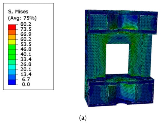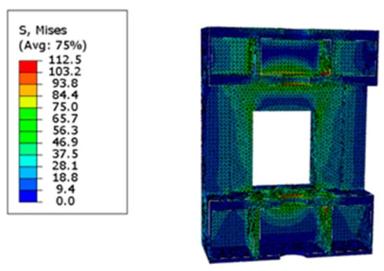 In order to analyze the distribution of stress and displacement inside the COF machine, half of the COF machine was applied to analyze the distribution of the stress and the displacement. The equivalent stress distribution of the COF machine is shown in Figure 4.