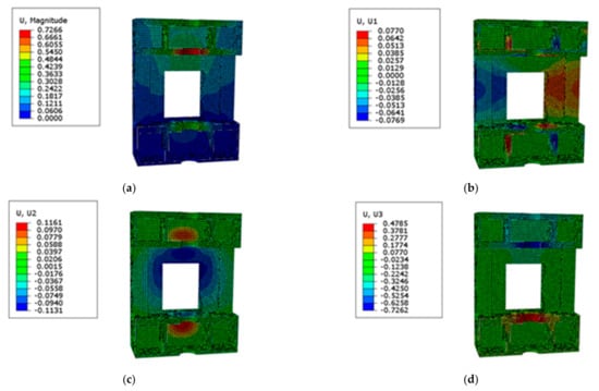Main displacement (a), x-scale displacement (b), y-scale displacement (c) and z-scale displacement (d) of the COF machine.