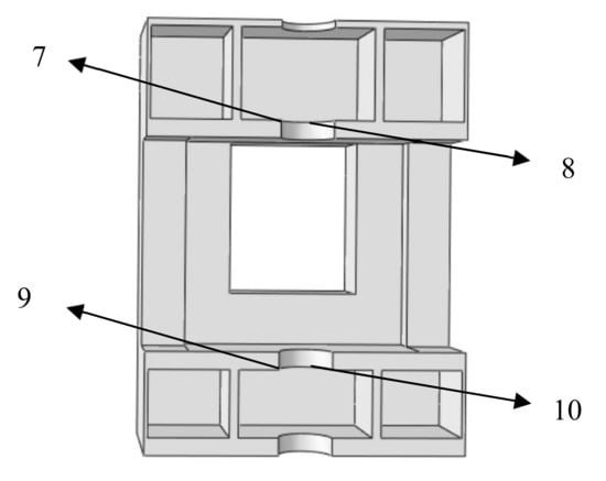The displacement of the COF machine is shown in Figure 7. Z-scale displacement of the COF machine is more obvious than the x-scale displacement and the y-scale displacement. The large displacement positions (Positions 7–10 in Figure 8) are mainly distributed near the upper and lower working tables, and the displacement of Position 8 (0.7267 mm) is the maximum in the COF machine. Large displacements of Positions 7–10 will be bad for the quality of the part and the fatigue life of the COF machine.