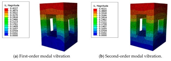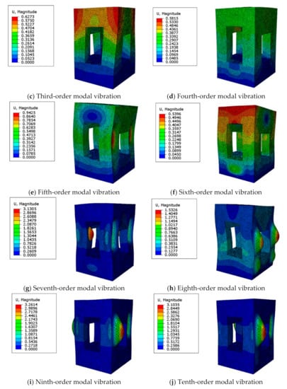 The first 10 orders of modal vibration of the COF machine are shown in Figure 10. In first-order and second-order modals vibrations, large x-scale displacement and large y-scale displacement exist on the COF machine. The upper and lower dies cannot be kept in alignment. The quality of the part will be affected and the dies will get worn. In third-order modal vibrations, the machine contorts around the z-axis. The forging stability of the part will be affected. In fourth-order modal vibrations, local vibration takes place on the top surface of the COF machine. In the fifth-order and sixth-order modal vibrations, x-scale displacement and y-scale displacement exist on the COF machine and the displacement is more obvious than the displacement in the first-order and second-order modal vibrations. The upper and lower dies cannot be kept in alignment. The quality of the part will be affected the and dies will get worn. In the seventh-order, eighth-order, ninth-order and tenth-order modal vibrations, local vibration occurs on the column of the COF machine. The local vibration is drastic and noise will easily happen.