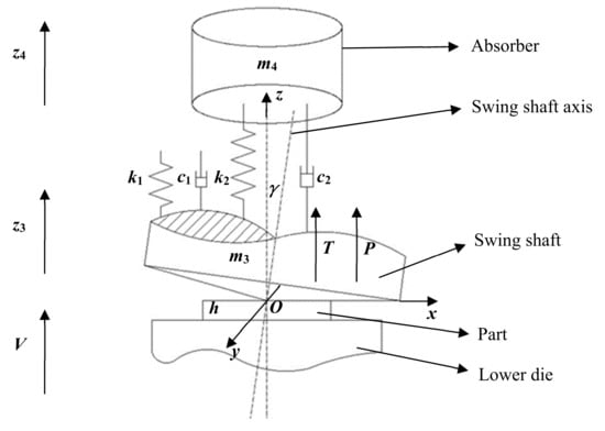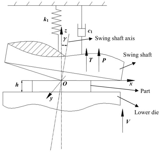 A vertical dynamic model of the swing shaft is shown in Figure 13. The vertical dynamic model is simplified as a spring-damping-mass model, and the concentrated mass is equivalent to the swing shaft. Here, k1 is the equivalent stiffness between the swing shaft and the swing shaft bearing (N/m), c1 is the equivalent damping between the swing shaft and the swing shaft bearing (N·S/m) and z3 is the vertical displacement of the swing shaft (m), of which the vertically upward direction is the positive direction of vertical displacement. The thickness of the cylindrical part after COF (h, m) can be calculated by h = h0 + z3 and h0 represents the thickness of the cylindrical part after COF, ignoring the effect of vibration (m); v is the vertical movement velocity of the forging part provided by the hydraulic system (m/s), P is the COF force (N) and T is the vertical external excitation of the swing shaft (T = Fsinωt, N).