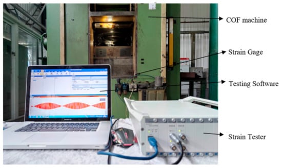 As shown in Figure 16, a strain test experiment was carried out on a 6300 KN COF machine to verify the effectiveness of the static analysis. In the strain test experiment, the value of the initial thickness of the part was 0.05 m and the value of the radius of the forging part was 0.038 m. During the COF process, the strain of the COF machine was acquired by a strain gage and the strain signal was transmitted to the strain tester. The strain values of Positions 11–14 can be viewed and analyzed in the testing software. During the COF process, the strain values of Positions 11–14 were time-varying and the maximum strain value of each position was recorded.