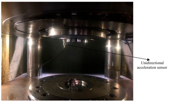 As shown in Figure 17, a verification experiment was carried out on a 6300 KN COF machine to verify the effectiveness of the dynamic model. The main equipment used for the verification experiment is shown in Table 4. In the experimental process, the angular velocities of the inner eccentric ring and the outer eccentric ring were 8π ad/s and the hydraulic system drove the forging part to move upwards. In Figure 18, a unidirectional acceleration sensor is installed on the swing shaft. The unidirectional acceleration sensor applied in the experiment was a piezoelectric unidirectional acceleration sensor (ICP). The working principle of a piezoelectric unidirectional acceleration sensor is that the embedded piezoelectric wafer is extruded by the shell mass during movement, thus generating a voltage signal. Subsequently, the voltage signal will be converted into a charge signal to achieve acceleration signal acquisition and processing. During the COF process, the vertical acceleration signal of the swing shaft is acquired by an acceleration sensor, and the vertical acceleration signal was transmitted to an LMS signal acquisition instrument. V The vertical acceleration signal of the swing shaft can be viewed and analyzed in LMS.Test.Lab software. Furthermore, in the verification experiment, it is necessary to avoid interference caused by the relative movement between the data line and the swing shaft. The data line should be a shielded line to avoid mutual interference between data lines. Meanwhile, the data line should be fixed to avoid shaking, and the data line fixed on the ground should avoid being compressed.