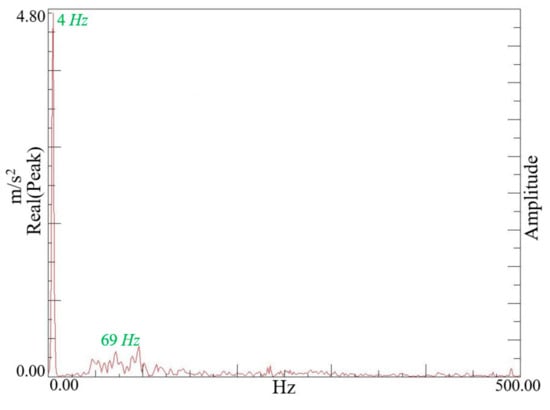 In LMS software, the vertical acceleration signal of the swing shaft was fast Fourier transformed. The time-domain signal of the vertical acceleration of the swing shaft was transformed to a frequency-domain signal. The experimental vertical acceleration frequency-domain curve of the swing shaft is shown in Figure 19. It can be seen that the vertical vibration of the swing shaft is a low-frequency vibration and the frequencies of vertical acceleration with high amplitude are 4 Hz and 69 Hz. If we compare Figure 19 and Figure 14, the simulation frequencies of vertical acceleration with high amplitude are very close to the experimental frequencies. The dynamic model of the COF machine is verified effectively.