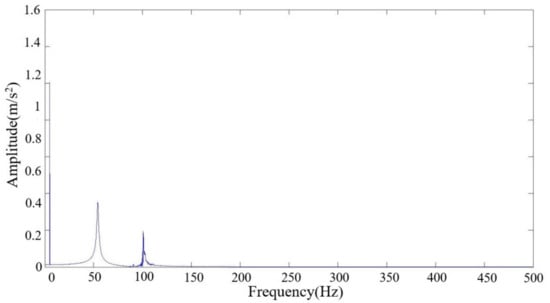 The parameters of 6300 KN COF machine are shown in Table 2, bringing COF machine parameters into the vertical dynamic model, so numerical simulation solutions can be obtained. Fast Fourier transform (FFT) is a kind of transformation method. FFT can transform a vertical acceleration time-domain curve into a vertical acceleration frequency-domain curve. After FFT of the vertical acceleration time-domain curve, the vertical acceleration frequency-domain curve of the swing shaft can be obtained, shown in Figure 14. As shown in Figure 14, the peak values of the frequency-domain curve of vertical vibration arise at 4 Hz and 61 Hz, and the vertical vibration of the swing shaft is a low-frequency vibration.