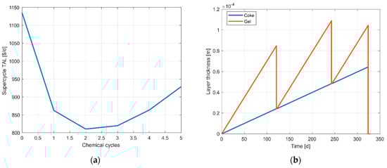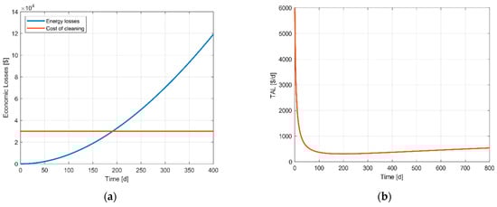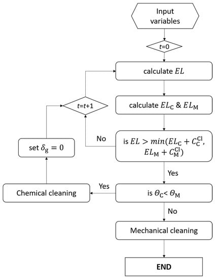 Finally, the last cost item is represented by the cost of the cleaning operation itself, abbreviated with and for the chemical and mechanical cleaning techniques respectively. The costs of cleaning have been assumed as constant in time. Although the code does not account for inflation and market trends’ influence, it is still possible to implement within it these aspects for real applications. However, this is not the purpose of this work.