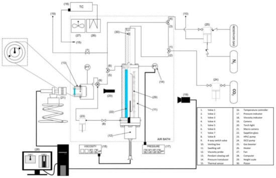 VIPS apparatus is designed to be a multifunctional instrument for several measurement methods, such as PVT cell/synthetic live oil generation, swelling apparatus/viewing cell, high pressure and temperature viscosity measurements, and vanishing interfacial tension (VIT)/pendant drops method that can be used to measure several properties to determine the MMP. They are simultaneously measured on the same sample composition. This apparatus can operate up to 5000 psi and 212 °F. The novel apparatus diagram is shown in Figure 1.