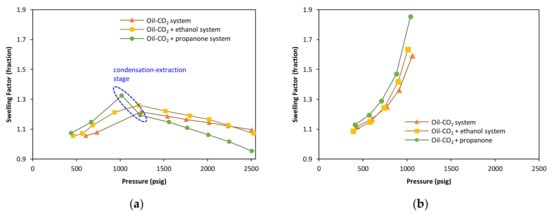 The swelling factor of Sample A1 showed two different lines to represent condensation (increasing swelling factor) and extraction (decreasing swelling factor) stages (Figure 2a). The two slopes also occurred in the IFT and the viscosity curves (see Figure 7), the point of change of which occurred almost at the same pressure as with that of the swelling factor curve. There is a discontinuity in the swelling factor curves between the condensation and the extraction stages of CO2–propanone mixed injection (see the dot-marked green line in Figure 2a). This discontinuity of the curves is known as the start point of condensation-extraction stage based on the analysis presented by Abdurrahman et al. []. On the other hand, the strong light-component extraction was observed by Nobakht et al. [] before this kind of discontinuity was clearly understood. This phenomenon, i.e., the extraction of the oil phase to the “upper phase,” could also be observed in our experiment through the window of the swelling cell when the injection took place inside the cell. This process occurred in a very short period of pressure increment. Note that the term “upper phase” is used to define the existence of the two phases inside the cell, i.e., the oil and the upper one. In this case, the phase above the oil was no longer pure CO2 because slight extraction had begun, therefore the phase contained the extracted oil. According to the study by Siagian and Grigg [], this indicates a phenomenon of which the density of the upper phase increases rapidly. This rapid increase in density corresponds to the rapid increase in the extraction capacity of the CO2. Thus, after the swelling factor reached its maximum value through condensation stage, the light-component of the oil was extracted either with strong or weak extraction (indicated by sudden drop of the swelling factor) and then followed by the extraction of the heavier component of the oil (indicated by low-slope curve) as the lighter one became scarce. In our experiment, the phenomenon was indicated by a significant drop in the value of the swelling factor, exposing some kind of discontinuity. The swelling factor of CO2–ethanol mixed and pure CO2 injections did not have this kind of discontinuity in their curves between the condensation and the extraction stages. This may be due to the condensation stage not being strong enough to indicate the light-component extraction, or the extraction capacity of the CO2–propanone mixed injection indeed being much stronger.