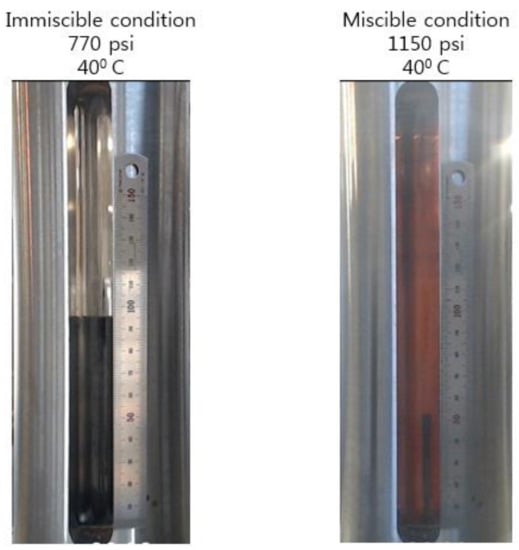 There is a different trend in the swelling factor curves for Sample A1. The two curve trends (shown in Figure 2a) indicate the extraction and condensation-extraction stages that are represented by the decreasing swelling factor curve after it reaches its maximum value. Differently from Sample A1, there were no such distinctive curves in any cases using Sample A9 (see Figure 2b). These curves are similar to the experimental results published by Simon and Graue [] which showed only the increasing swelling factor curve, i.e., the condensation stage. Miscibility conditions were observed in Sample A9 after a pressure at which each set of experiment reached the highest swelling factor and there was no contact between oil and CO2 seen in the chamber (Figure 3). By definition, under this condition, the swelling factor is unidentified. In contrast, oil column and contact between CO2 and oil was clearly observed during the experiment of Sample A1, where the swelling factor could be measured even at a pressure as high as 2500 psi. The views from the chamber for both immiscible and miscible conditions of Sample A9 for pure CO2 injection are shown in Figure 3.