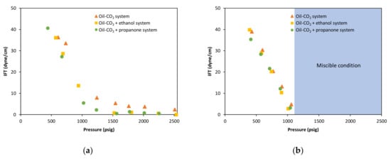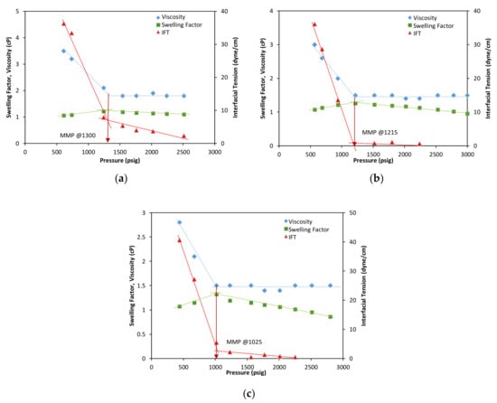 Another study by Hakim [] attempted to determine the MMP by using the combination of swelling factor, IFT and viscosity curves. The author determined that the MMP occurs at the pressure where the curves of those three properties start to turn into the second slope, such as that described in Figure 7a–c. The MMPs between Sample A1 and CO2 for the case of pure CO2 injection, CO2–ethanol mixed injection, and CO2–propanone mixed injection were 1300 psi, 1215 psi, and 1025 psi, respectively. According to these results, propanone and ethanol are proven to be able to reduce the MMP of Sample A1.