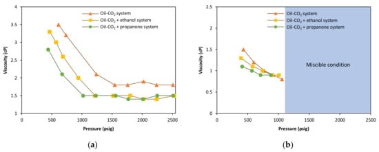 Solvents in the oil industry are also commonly used to lower oil viscosity. Issues in oil transferring, especially for heavy oil, such as transport difficulties in pipelines can be solved by adding a proper solvent to the crude oil. Gateau et al. [] found that the dilution efficiency of solvent depends on its polar functional group. The higher the polarity parameter or the hydrogen bonding parameter of the solvent, the lower the resultant oil viscosity []. The way that solvent polarity works is expected to give more advantage to the CO2 injection performance, especially for heavy oils and mature fields.