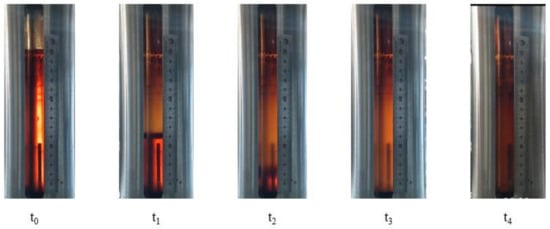 The swelling factor of Sample A9 did not have the strong light-component extraction stage (see Figure 2b). The mechanism leading to its miscible condition is still uncertain as to whether it is a condensation or vaporization/extraction process. During circulation at the pressure where the miscibility occurred, the interaction between the oil and the “upper phase” resulted in a new kind of fluid which kept its form after one cycle of circulation (see Figure 8). There was no fluid phase that changed after the equilibrium pressure had been reached. The similar phenomena were found for all other three cases in our experiment using Sample A9. However, addition of propanone to the CO2 injection still made Sample A9 have higher swelling factor than those of the other two cases during the condensation stage. This phenomenon shows that propanone increases the CO2 solubility into the oil during the condensation stage better than that by ethanol.