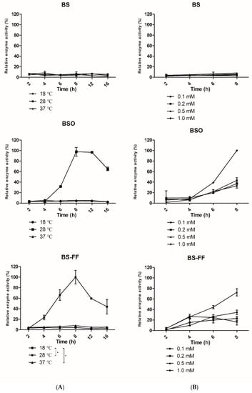 As depicted in Figure 1B, the optimal IPTG concentration to induce the expression of the BSO recombinant enzyme was approximately 1.0 mM, and the optimal IPTG concentration to induce the expression of the BS-FF recombinant enzyme was approximately 0.5 mM. Enzyme expressed from the BS recombinant expression vector was still not secreted at either IPTG concentration.