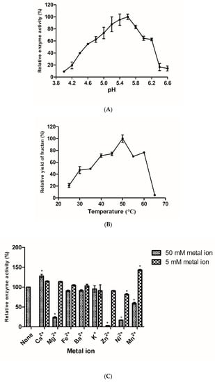 Effect of pH, temperature, metal ions on the activity of recombinant fructan sucrase. (A) Effect of pH on the activity of recombinant fructan sucrase; (B) effect of temperature on the activity of recombinant fructan sucrase; (C) effect of metal ions on the activity of recombinant fructan sucrase. The values are representative results obtained from at least three experiments. Error bars indicate standard deviations (SD) based on more than three independent experiments. * p < 0.01, t-test.
