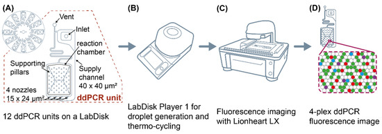 Workflow for an automated four-plex digital droplet polymerase chain reaction (ddPCR) in a LabDisk. (A) LabDisk with 12 identical ddPCR units. Each unit consisted of an inlet, a venting structure, a supply channel, a reaction chamber with supporting pillars and four nozzles for droplet generation by centrifugal step emulsification. (B) Droplet generation and thermocycling in LabDisk Player 1. (C) Fluorescence imaging with an automated Lionheart LX fluorescence microscope. (D) Four-plex ddPCR fluorescence image and data evaluation with Gen5 software to evaluate the assay performance.