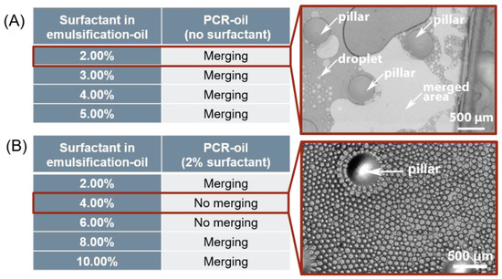 Evaluation of surfactant concentration in emulsification-oil and PCR-oil. (A) A mix of 2–5% surfactant in emulsification-oil combined with pure PCR-oil. The microscopy image shows merged areas as bright. (B) A mix of 2–10% surfactant in emulsification-oil combined with 2% surfactant in PCR-oil. Exemplary microscopy image shows a droplet area with 4% surfactant in emulsification-oil.