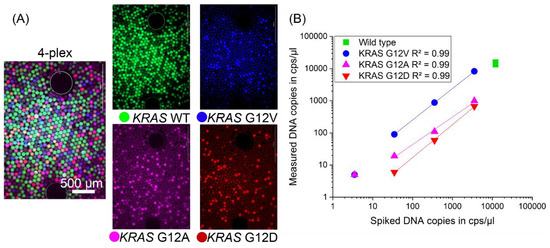 (A) Fluorescence image overlay of the four-plex ddPCR assay for the KRAS wild type (WT) and the point mutations KRAS G12D, G12V and G12A. Individual fluorescence images show amplification signals in all three color channels for the mutant DNA and in the fourth color channel for the wild type DNA. (B) The proof-of-concept serial dilution experiment showed the high reaction linearity of the four-plex ddPCR assay inside the LabDisk across 3540–35 mutant DNA copies per µL. The lowest dilution point (3.5 mutant DNA copies per µL) was quantifiable for KRAS G12V and G12A, but not for G12D.