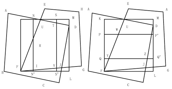 By calculating a set of initial points and then deriving them as a starting point, the optimal stitching line is selected from the smooth stitching lines of the last multiple texture seams of remote sensing images, thereby saving the calculation time [20]. Taking Figure 1 as an example, we select five candidate initial points on NS. The coordinates of point N, point U, and point S are , and , respectively. However, because the ordinate values of the three candidate initial points are the same, the coordinate corresponding to the point on NS is , the line from the point to the intersection point of UR and UT is denoted as , and the gradient error can be calculated by: