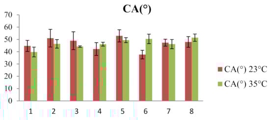 Comparative graphical representation of the contact angle values for the 8 samples analyzed at the two temperatures (23 °C and 35 °C).