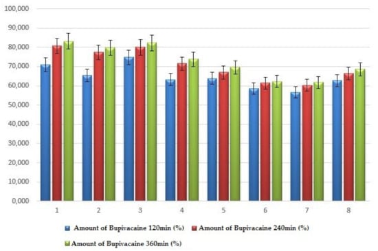 Table 7 shows the cumulative percentages of bupivacaine hydrochloride released after 120 min, 240 min and 360 min, along with the 3 formulation variables (X1: concentration percentage of chitosan; X2: concentration percentage of HPMC E 5 LV; and X3: polymer ratio for chitosan/HPMC E 5 LV). The colloidal gelling in situ systems released more than 56% of the drug substance after 2 h, and after 6 h, they released between 61.7% (system 7) and 83.1% (system 1) of the drug substance.