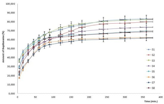 The dynamics of bupivacaine hydrochloride release from the formulations under analysis over 6 h is shown in Figure 6. The highest amount of the drug released after 6 h (83.198%) and was recorded in the case of system 1 (0.5% chitosan, 2% HPMC E 5 LV and polymer ratio 1/1). This was followed by system 3 (0.5% chitosan, 5% HPMC E 5 LV and polymer ratio 1/1), in which the amount of bupivacaine hydrochloride released after the same interval of 6 h was 82.291%. The cumulative percentage of the drug released in vitro from the eight colloidal systems is plotted against time in Figure 7.