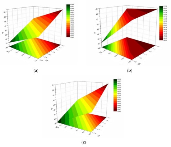 Highlighting in 3D the evolution of the Y (viscosity) parameter according to the formulation variables (a) X1 (chitosan concentration) and X2 (HPMC E 5 LV concentration); (b) X1 (chitosan concentration) and X3 (chitosan/HPMC E 5 LV ratio); and (c) X2 (HPMC E 5 LV concentration) and X3 (chitosan/HPMC E 5 LV ratio).