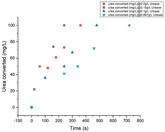 In Figure 2, the graph shows that the time taken for urea to hydrolyze in any wastewater containing urea depends on the amount of urease present or added. This also implies that the higher the enzyme urease concentration, the greater the conversion/hydrolysis. For this study, we will be using a urease concentration of 0.067 g/L.