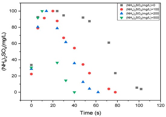As can be seen in Figure 4, urea hydrolysis to ammonia is the best with no addition of NH4-N, and this is achieved at around 10 h. Moreover, a drastic increase in the time for the urea to hydrolyze occurs as the ammonium nitrogen concentration is reduced, and this in turn increases the urease activity. The enzyme activity is higher with no NH4-N addition 0 mg/L (NH4)2SO4 although it takes more time to attain the maximum 100 mg/L urea hydrolysis (28 h). The results suggest that urease is inhibited by higher (NH4)2SO4 concentrations. This concurs with a research conducted by Deli Tong and Renkou Xu in 2011 []. In a similar study by Kumar and Wagenet, urease activity was reported to be lowest in alkaline and saline []. This study agrees with a study in which solutions of divalent salts Na2SO4 and (NH4)2SO4 were added to a solution containing enzyme. The efficiency of the formation of the polyelectrolyte-protein complexes was affected by the salt action; at low salt concentrations, the enzyme was drastically activated and it was inhibited at higher salt concentrations []. These data can be used to evaluate the optimal working conditions for bioremediation and wastewater treatment either on a pilot-scale or in big plants.