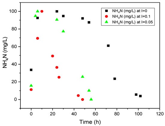 Several chemical processes exist for manufacturing ammonia. The three most well-known and widely used methods are the Haber–Bosch process, indirect electrochemical process, and urea decomposition. The Haber–Bosch process was developed a century ago and is implemented at a very high temperature of between 400 and 500 °C and a pressure of between 130 and 170 bar. In this process, gaseous hydrogen and nitrogen react over a metal catalyst at a high temperature and pressure []. This process is very costly as it requires higher temperatures and pressures. Secondly, an electrochemical process is also used for removing ammonia and other pollutants from wastewater. It is a reliable process for treating wastewater with the advantages of minimal sludge generation, high operating efficiency, and the ability to operate under a wide range of ambient temperatures. The limitations of this process include: chlorine ion concentration in wastewater, pH, current density, the electric voltage applied, and the type of anode used. Higher current densities also affect this system, as this leads to more electric power consumption and directly increases the operational cost []. Another process used in ammonia removal/recovery is urea decomposition by either catalytic, strong oxidant, or hydrolysis processes. All these processes listed above have their respective limitations and costs as all are conducted at high temperatures and pressures, which limits their usage by many industries [].