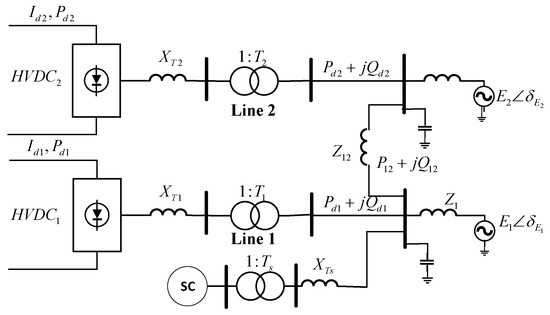 2.2. The Power Transmission Mathematical Model of the Double-Infeed LCC-HVDCs with Synchronous Condenser