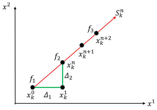 | 2: Let , set as starting point and search along the direction , then search points can be obtained and named as |