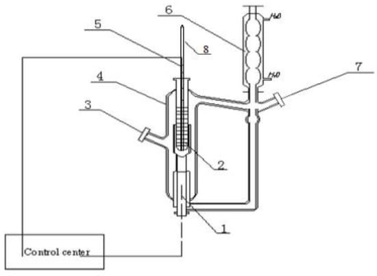 Constant pressure double circulation vapor–liquid equilibrium kettle. 1—heater rod; 2—thermometer sleeve tube; 3—liquid phase sample connection; 4—liquid phase sample connection; 5—thermal resistance; 6—condenser; 7—vapor phase sample connection; 8—mercury thermometer.